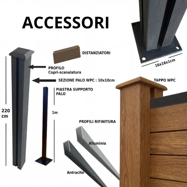 Pali WPC 10x10x210cm: Alloggi listoni + profili/mascherine 4 lati (alluminio disponibile).